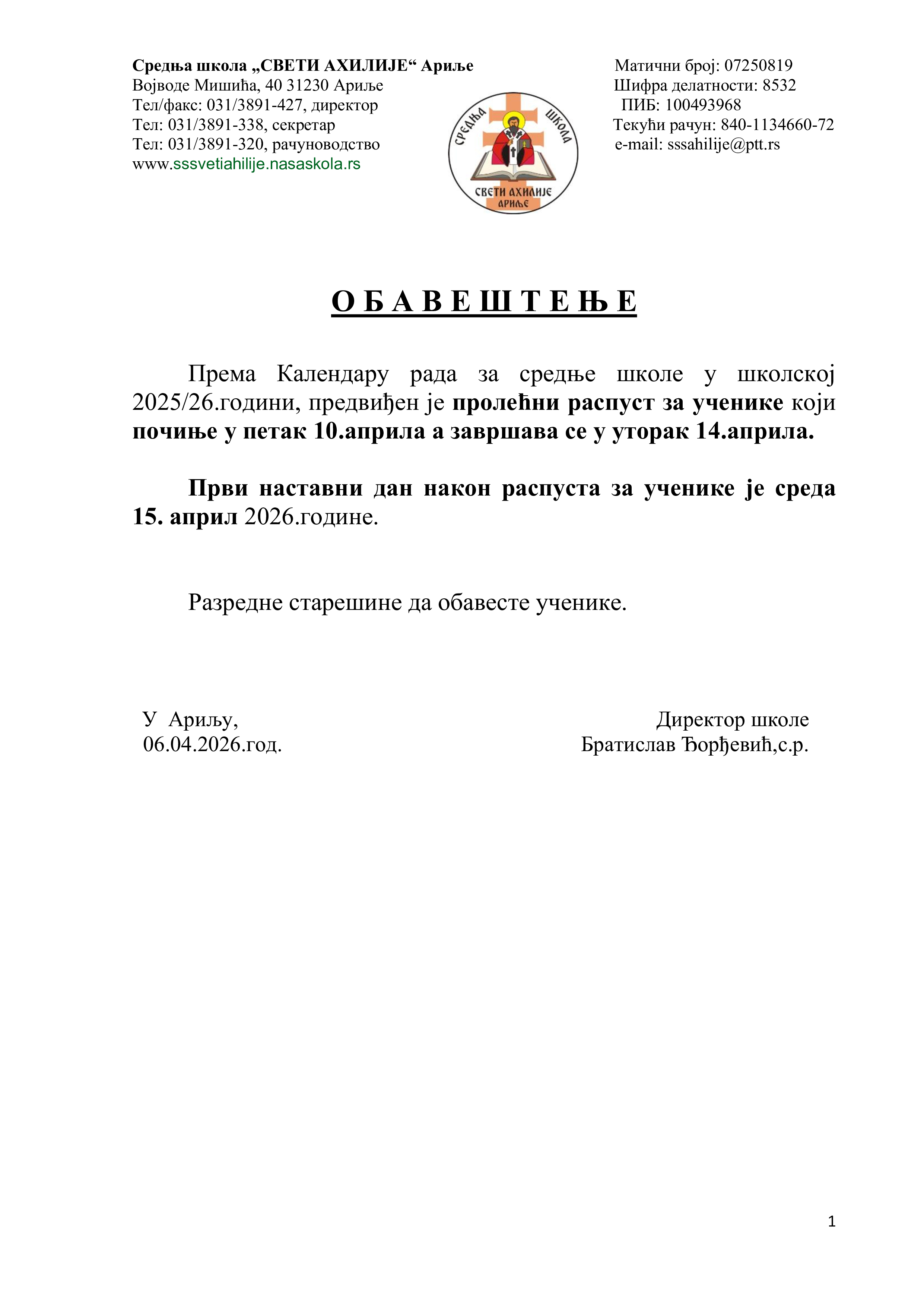 Обавештење - пролећни распустДатум: 06. April 2026 12:16 Категорија: Обавештења Прочитај |