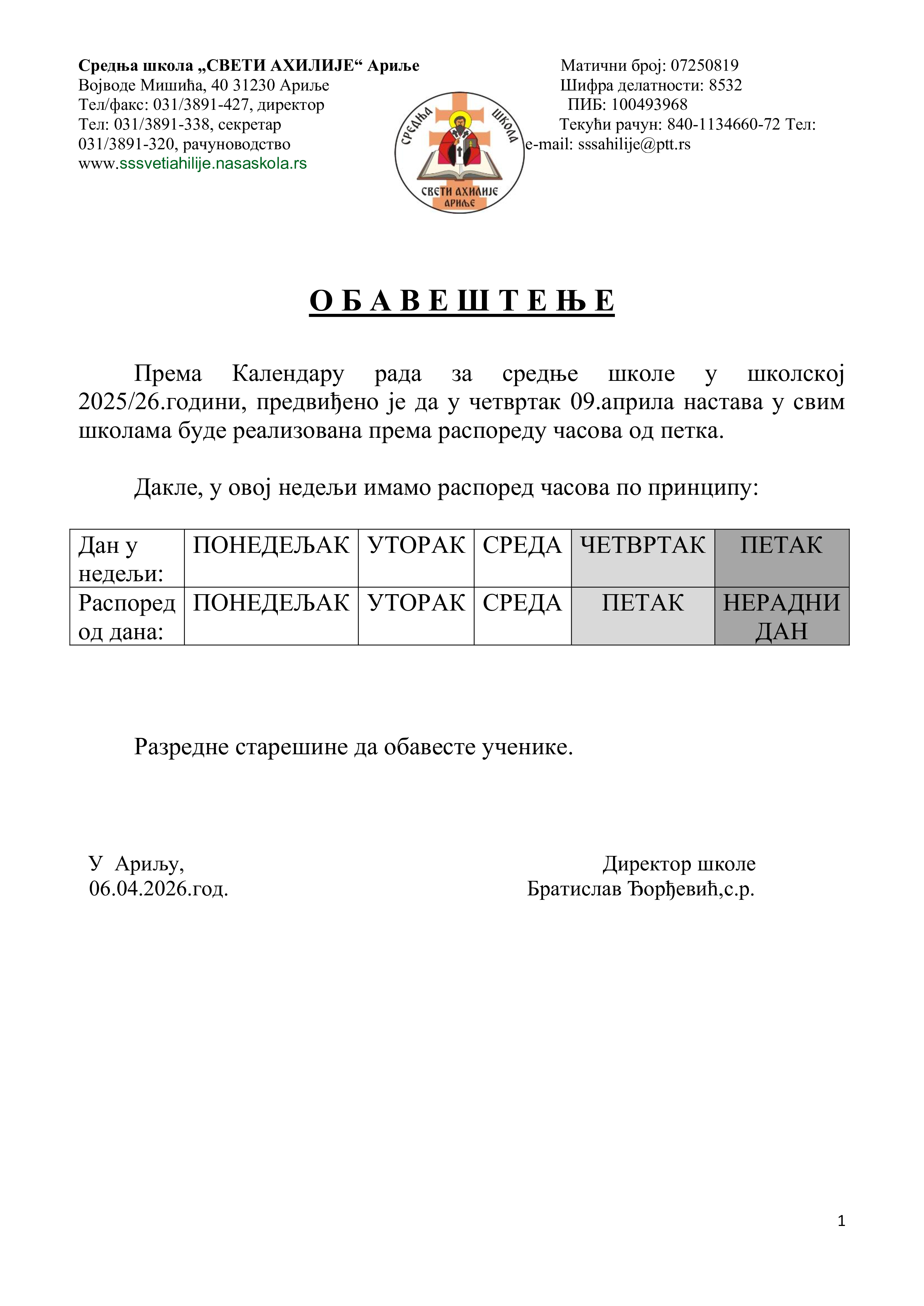 Oбавештење - измена распоредаДатум: 06. April 2026 12:15 Категорија: Обавештења Прочитај |